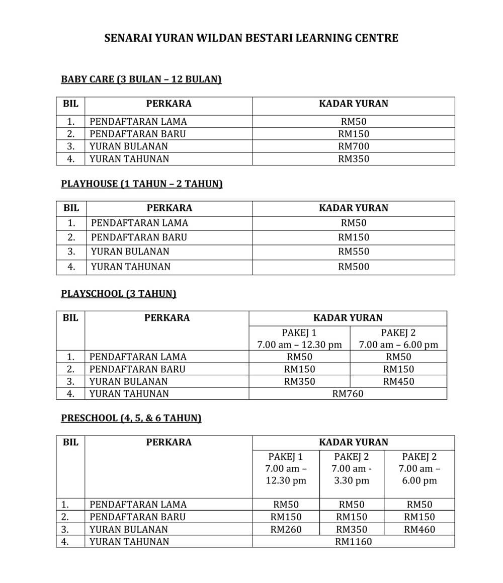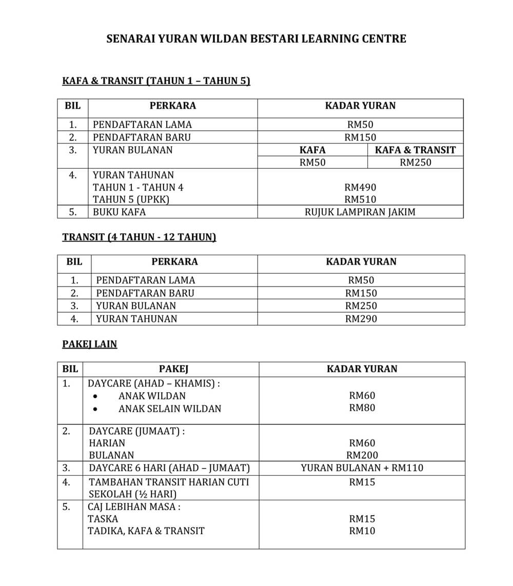 Saya memohon untuk mendaftar dan menghantar anak / jagaan saya ke WILDAN BESTARI ISLAMIC PLAYSCHOOL & KINDERGARTEN. Saya mengaku bahawa segala maklumat yang diberikan di dalam borang ini adalah benar dan tepat. Saya sebagai ibubapa / penjaga berjanji akan membayar semua yuran tahunan dan yuran bulanan ( sebelum / pada 5hb setiap bulan ) mengikut kadar yang telah ditetapkan oleh pihak Pengurusan WILDAN BESTARI ISLAMIC PLAYSCHOOL & KINDERGARTEN dan seterusnya saya atau kami mengiktiraf segala syarat dan peraturan yang telah ditetapkan oleh pihak Pengurusan WILDAN BESTARI ISLAMIC PLAYSCHOOL & KINDERGARTEN ke atas anak / jagaan saya / kami.